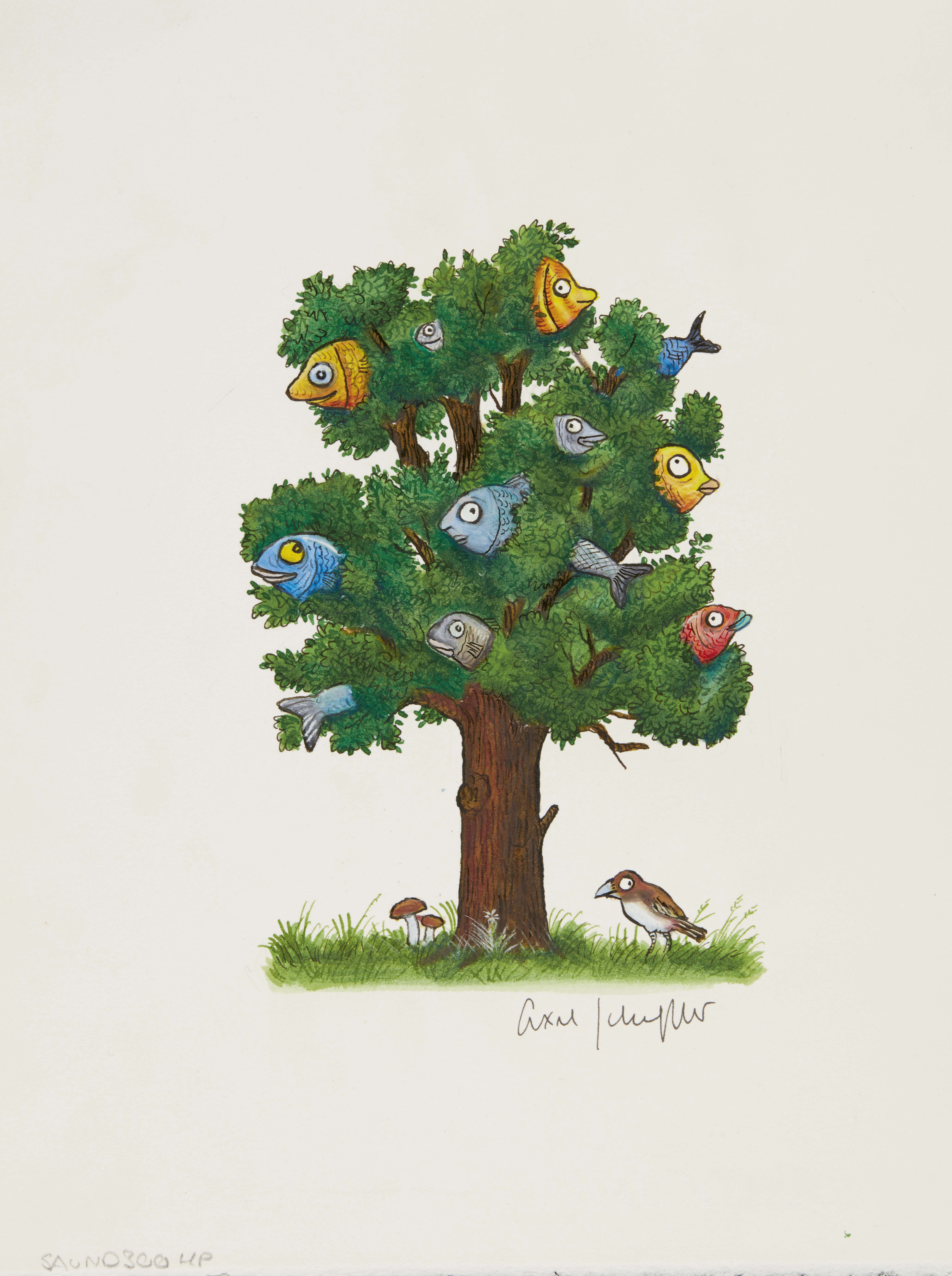 Axel has donated the front cover and book jacket artwork from his recent collaboration with Roger McGough, the poetry collection Fish Dream of Trees. You can bid in person, online or by phone.