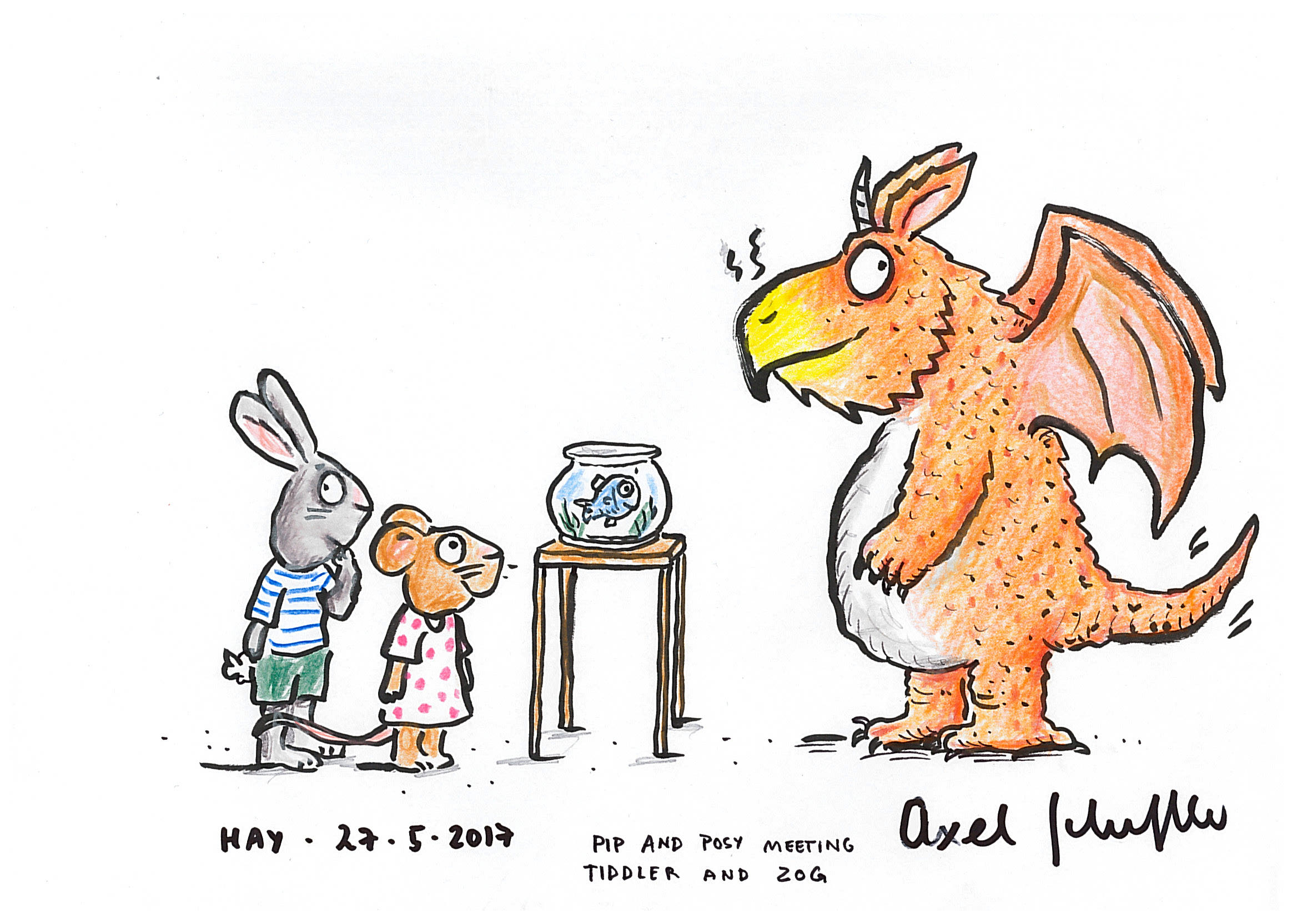 Bid for Axel's drawing of Pip and Posy meeting Zog and raise money for Three Peas charitable work helping refugee families and individuals in Greece.
